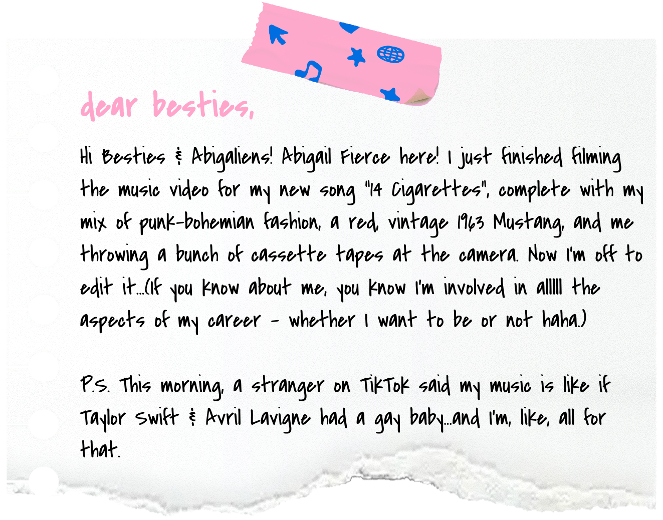 Scream It to the Whole World by Abigail Fierce (me) - I wrote this song as a healing thing. I never thought I would release it, but I decided it was too important of a song to not release. When I get messages from people who say this song helped them come out, it's the best feeling in the world. (I always say my music is like Courtney Love & Alanis Morissette mixed with Taylor Swift & Ed Sheeran and I think you can really hear all my influences on this track.)