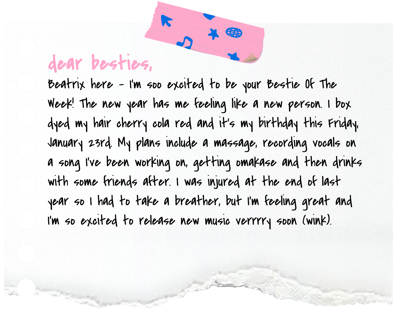 Here’s a look at Beatrix’s favorite music lately, meme’s and the like: